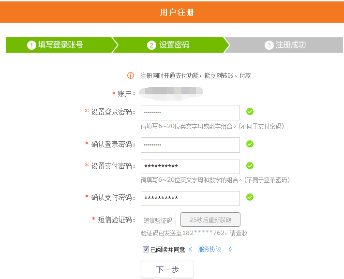 第二步设置密码,需要用户下载安全控件才能设置支付密码,获取短信验证码;点击下一步注册成功后3秒自动跳转到账户主页。
