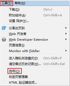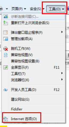 1、点击浏览器右上角的图标(或选择菜单栏的“工具”),在下拉菜单中选择“Internet选项”;