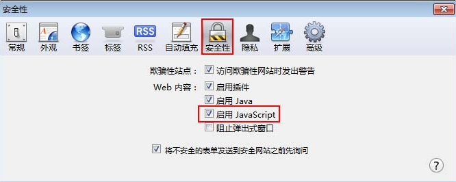 2、在弹出的对话框中,选择“安全性”选项卡,勾选“启用JavaScript”后关闭对话框即可。