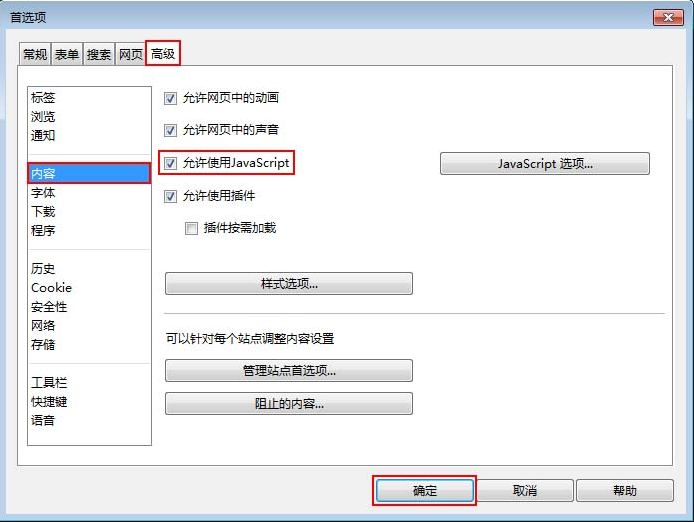 2、在弹出的对话框中,选择“高级”——“内容”,勾选“允许使用JavaScript”后确定即可。