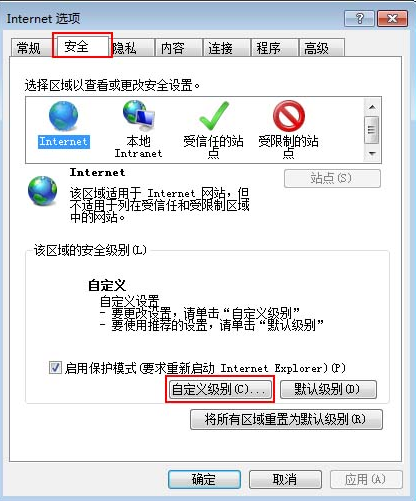 2、在弹出的对话框中,点击“安全”——“自定义级别”;