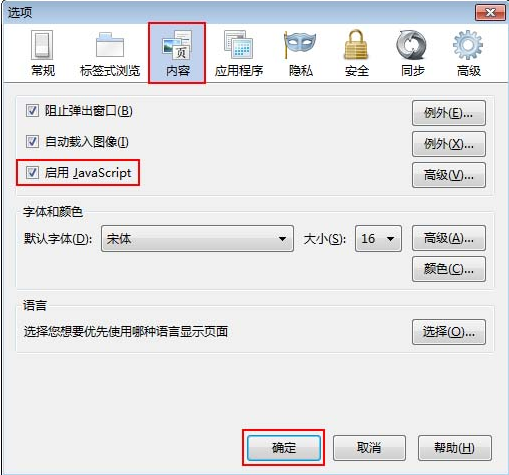 2、在弹出的对话框中,选择“内容”选项卡,勾选“启用JavaScript”后确定即可。
