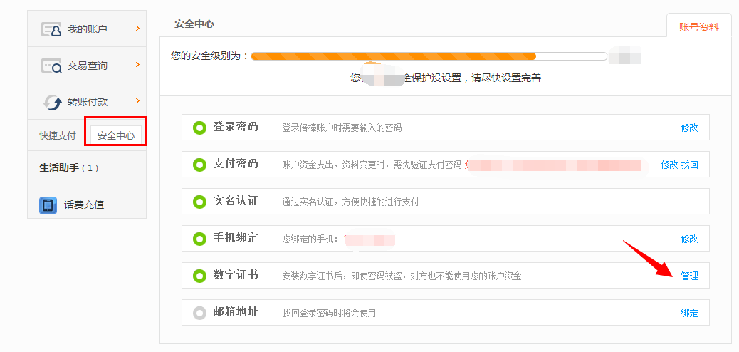 第一步:点击“安全中心”,在数字证书一项里选择“管理”